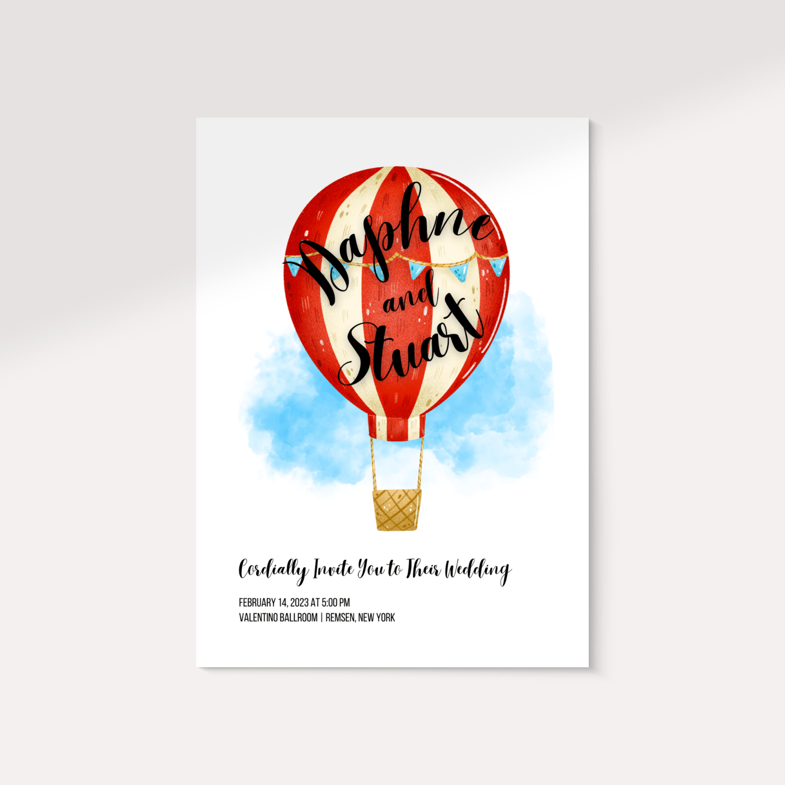 Begin your hot air balloon wedding adventure with invitations that set the sky-high tone. Opt for designs featuring hot air balloons against a backdrop of dreamy clouds. Use soft, pastel colors like sky blue to convey the romantic and ethereal atmosphere.